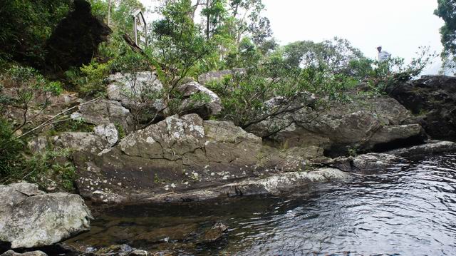 Dũng Silk cùng một vài "bô lăo" nhóm A thử bước xuống, nhưng chỉ đi khoảng hơn 200 bậc đă phải quay lên v́ liệu rằng sức già "chịu không xiết" và mặt khác, thấy bóng chiều bắt đầu sẫm lại th́ ḷng đâm ra hoang mang. Chúng tôi gặp một nhóm người dân Đá Bạc, trong đó có hai người phụ nữ, lên đây tham gia nhóm MIA, đi t́m hài cốt phi công Mỹ. Họ đă trải qua gần 60 ngày làm việc ở đây. Họ bước thoăn thoắt và cho biết họ đi xuống mất 15 phút và đi lên mất 16 phút! Thật là đáng nể.