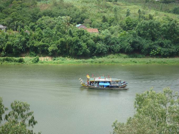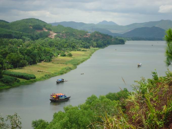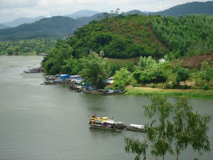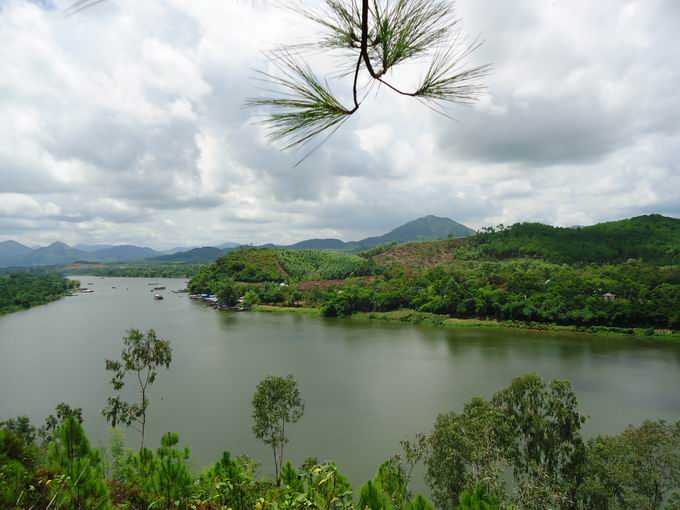 Sau lưng dãy đồi màu xanh lục có hình thù như con kè nhông bò ra sông uống nước. Đầu của nó chính là Ngọc Trản Sơn, hay chén ngọc.