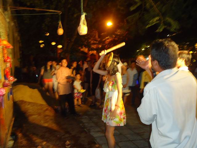 gậy ngắn và đập vào chiếc b́nh bằng đất nung treo trên