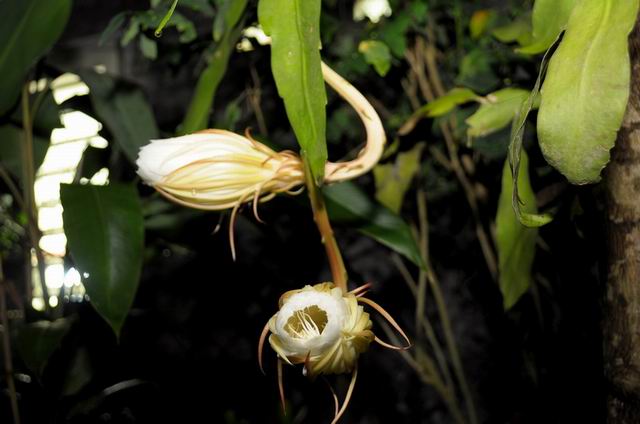 Hôm thứ hai, 30/9/1013, tin từ đài khí tượng cho biết tâm bão sẽ đi qua Huế, nhưng giờ chót, bão (thay đổi ý định) chuyển hướng chút xíu lên phía tây bắc, qua miền Đồng Hới, Quảng Bình, vượt qua dãy Trường Sơn và nhẹ nhàng lướt qua đất Ai Lao. Tuy tâm bão không ghé, nhưng những làn gió xoáy, gió giật, gió lộng, mưa rào cũng trình diễn một màn kịch đầy sức mạnh tàn phá. Thứ ba, 1/10, trời quang mây tạnh, một người bạn reo lên trong máy điện thoại: tối nay hoa quỳnh nở, mời sang nhà thưởng hoa và ăn cháo nấm tràm. Nấm tràm và hoa quỳnh không biết có duyên gì với nhau mà cùng xuất hiện cùng thời trên đất Huế. Chợt nhớ cách đây mấy hôm, tại quán cà phê Cung Đàn Xưa, nơi cũng có nàng quỳnh trú ngụ, phó nhòm Nguyễn Văn Sum "cất tiếng than": cả đời chưa được xem hoa quỳnh nở bèn gọi điện mời cùng đi. Thế là không uống rượu, không đánh cờ, không chờ trăng lên (27 tháng 8, lịch theo con trăng) (Nguyễn Du: Khi chén rượu, khi cuộc cờ, khi xem hoa nở, khi chờ trăng lên), khách và chủ ăn cháo nấm tràm tiễn đưa cơn bão hài văn lần bước dặm xanh (ND) qua vườn Huế (làm vài cây to đổ, vài chậu ngã nghiêng) và rồi, cùng uống trà và xem hoa nở. Sum đặt câu hỏi với chủ nhân khóm quỳnh: Làm sao biết được tối nay hoa quỳnh nở? Trả lời: ngày hôm nay thấy hoa lớn nhanh bất thường thì biết. 6: 00 chiều, hoa còn búp. 6: 45 nụ hoa bắt đầu hé . Kể từ khi đó cho đến 9 giờ hoa cười nụ, cười mím chi, cười duyên, cười tủm tỉm, rồi cười ha hả, để lộ những sợi nhị vàng kết thành một nụ hoa trong hoa, và ẩn đằng sau là những nhị vàng khác kết thành một tấm màn ren rất cân đối, tinh vi. Những cánh đài mỏng nở tung, có khi nhẹ nhàng, có khi bật ra sau rất nhanh và mạnh, làm cả cành hoa rung rinh. Những cánh hoa trắng thật tinh khiết, mong manh, mờ ảo, xếp chồng lên nhau như e ấp, thẹn thùng, và tỏa hương thơm nhè nhẹ. Sau cùng, khi hoa cười "hết cỡ", khách nhàn du dời gót. Khoảng 10 giờ chủ nhân nhắn tin vì tiếc ngọc thương hương nên đã cắt hoa đưa vào tủ lạnh, nếu không, đến sáng sớm thì hoa héo rũ như đã tàn mấy ngày rồi. Hoa quỳnh, không phải sớm nở tối tàn như hoa phù dung, mà đầu đêm nở, chưa tới cuối đêm đã tàn. Quỳnh hoa (và cả bão) không biết hữu ý hay vô tình dạy người đời bài học vô thường rất sống động, gây ấn tượng mạnh mẽ. Sau đây là một vài hình ảnh ghi được trong đêm (không trăng, không sao).
