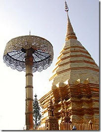 Khởi hành sớm, khoảng 5:30 đi bằng xe máy viếng ngôi chùa trên núi, có tên là Wat Phrathat Doi Suthep, cách thành phố chừng 16km. Trời c̣n tối và se se lạnh. Đến chân đồi đă thấy hàng trăm thanh niên ngồi theo hàng lối, chuẩn bị đi lên núi. Sau đó họ chạy theo từng nhóm khoảng 50-50 người. Ngoài ra có một số đi xe đạp, mặc đồ vận động viên. Lác đác có một số người đi xe pick-up chở theo nhiều container đồ ăn. Họ đỗ xuống bên đường, khiêng các container ra khỏi xe, chuẩn bị cúng dường các thầy từ trên núi xuống đi khất thực. Đường đèo khá dốc, kéo dài khoảng 10km, cây cối um tùm, núi non hùng vĩ. Khoảng giữa chặng đường người ta xây một vọng lâu cho khách dừng lại ngắm toàn cảnh sườn núi và thành phố bên dưới. Sương khói từ rừng cây bốc lên mờ mờ. Lưng chừng núi cũng có một tượng Phật, nơi người dân địa phương hay đến cầu nguyện. Chùa xây trên đỉnh núi. Từ mặt đường phải leo lên mấy trăm bậc cấp mới tới. Hai bên bậc cấp người ta đắp tượng hai con rắn thần naga trườn từ trên cao xuống. Naga là một linh vật theo văn học Phật giáo và Ấn Độ giáo. Theo một sự tích, có lần Đức Phật đang ngồi thiền ở Bodhgaya th́ trời đổ mưa, rắn thần vươn chín đầu của ḿnh lên cao thành lọng để che cho đức Phật. Trong các chùa thuộc hệ phái Theravada thường thấy h́nh tượng Naga như một vị thần hộ pháp. Ng̣ai rắn thần c̣n có hai vị hộ pháp khác mang vũ khí, mặc giáp trụ, mặt mày dữ dằn, xua tan mọi ư nghĩ đen tối trong đầu khách viếng chùa.