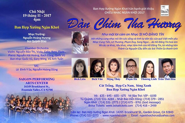Khơi tŕnh diễn. Từ những hào hùng của người chiến sĩ giữ nước, chuyển sang thân phận đau khổ, cay đắng buộc phải tha hương, mất nước qua bài Đàn Chim Tha Hương. Mở đầu bài hát này là phần solo, thê lương, buồn thảm, nhưng về sau sáng dần lên với phần bè hợp xướng và kết thúc với mong chờ một ngày mai đất nước huy hoàng. Cuối cùng sẽ là “Việt Nam Quê Hương Ngạo Nghễ” của Nguyễn Đức Quang, là bài hát truyền thống của Ngàn Khơi chọn để kết thúc chương tŕnh từ những năm qua. Từ ca viên đến khán giả sẽ cùng hát vang bài hát này, để khi ra về, mọi người đều có niềm tự hào về một Việt Nam ngạo nghễ. Đây không c̣n là tác phẩm tŕnh diễn nữa, mà ban tổ chức mời các khán giả cùng hát với các ca viên của Ngàn Khơi để những trái tim Việt Nam ly hương cùng hát vang và: “Cười ngạo nghễ đi trong đau nhức không nguôi, Chúng ta thành một đoàn người hiên ngang, trên bàn chông hát cười đùa vang vang. C̣n Việt Nam triệu con tim này c̣n triệu khối kiêu hùng…” Cũng như bao năm qua, những khán giả đă đến thưởng thức buổi diễn của Chiều Nhạc Ngàn Khơi đă ở lại đến phút cuối và ra về đều hài ḷng với những dư âm đẹp mà buổi nhạc để lại, v́ vậy Chiều Nhạc Ngàn Khơi “Đàn Chim Tha Hương” vào 4 giờ chiều Chủ Nhật ngày 19 tháng 11 năm 2017 sẽ tiếp tục đem đến nhiều thú vị cho người xem, xin quư vị đừng bỏ lỡ buổi nhạc giá trị này.