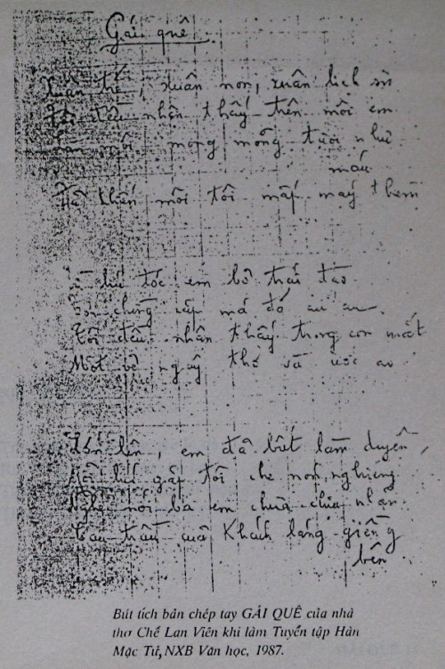 Được biết, tập Gái quê ở dạng bản sao tái xuất hiện lần này sẽ gồm 34 bài. Tức là nhiều hơn đến 1/2 so với dung lượng tập Gái quê do Chế Lan Viên sao lại bằng chép tay năm 1987.