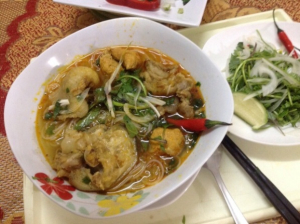 -Ăn bánh canh cua chả con nè! Như Ánh (lớp Pháp văn, khóa LVC) khéo tay, nấu ngon mà trang trí đẹp, bắt mắt nên món ăn càng hấp dẫn.