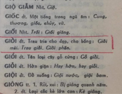 Thử tra các tự điển xem GIỒI, DỒI, TRAU, TRAU GIỒI (TRAU DỒI) được giải thích như thế nào? * TỰ ĐIỂN VIỆT NAM của Ban Tu Thư Khai Trí: GIỒI (đt) Trau tria cho đẹp, cho bóng Giồi mài, trau giồi, giồi phấn