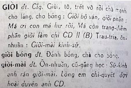 GIỒI - TỰ ĐIỂN VIỆT NAM của Ban Tu Thư Khai Trí * Tự điển của Lê Văn Đức: GIỒI: (đt) 1. Giùi, tô trét vô rồi chà mạnh cho láng, cho bóng. Giồi bộ ván. Giồi phấn, Má ơi con má hư rồi, má c̣n trang điểm phấn giồi làm chi. 2. Trau tria, ôn nhuần: giồi mài kinh sử.