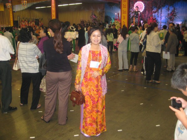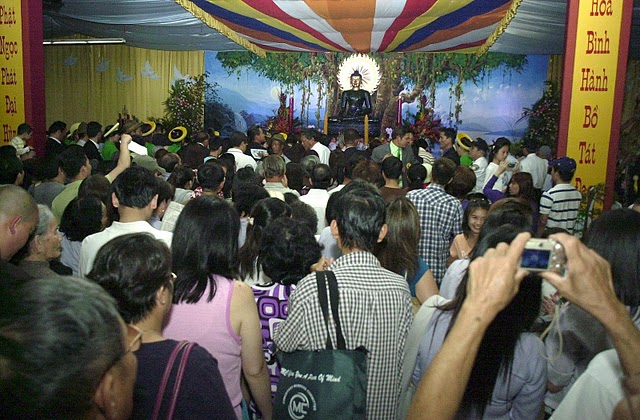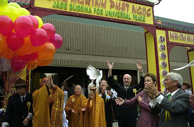 Về đến Hội Trường Ḥa B́nh, bà con tập trung ở đây thật đông. Mọi người đă xếp thành 2 hàng chào đón.Tiếng vỗ tay reo ḥ mừng rỡ... Tiếng cười nói rộn ràng, nhộn nhịp... Đoàn xe hoa tiến dần vào khuôn viên của hội trường. Những người làm phận sự có nhiệm vụ di chuyển tượng Phật vào trong Chánh Điện. Bởi tượng Phật Ngọc là một vật báu vô cùng quư giá, chứa đựng nguồn năng lượng linh thiêng & có giá trị tâm linh rất lớn nên các anh chị em rất thận trọng trong lúc di chuyển. Gần 2 tiếng đồng hồ, mọi người tận sức, tận lực mới di chuyển được tượng Phật vào nơi cung kính. Đêm thứ sáu ngày 17 tháng 9 năm 2010, tại Hội Trường có tổ chức một buổi văn nghệ chào đón Lễ Cung Nghinh Phật Ngọc. Buổi văn nghệ tập trung đông đảo các ca sĩ địa phương & các ca sĩ tên tuổi như: Thanh Thúy, Gia Huy, Duy Trường... Bà con cũng đă đến tham dự thật đông. Đúng 10 giờ sáng thứ bảy, ngày 18 tháng 9 năm 2010, Đại Lễ Cung nghinh Phật Ngọc diễn ra. Không khí tưng bừng vui tươi như ngày hội. Cả Hội Trường Ḥa B́nh tràn ngập một rừng người …Hàng chục ngàn người về tham dự, đầy đủ các áo hoa… ai nấy đều áo dài, khăn đóng chỉnh tề. Dọc theo đoạn đường Senter, xe cộ hàng loạt cứ nối đuôi nhau tiến vào hội trường. Phía sau hội trường, có gần 40 gian hàng bán quà lưu niệm & quầy ăn uống giải khát… Đại diện cho ban tổ chức, toàn thể anh chị em đă sắp thành hai hàng áo dài màu xanh ngọc, khăn đóng đứng từ ngoài cổng chính vào tới cửa hội trường. Tiến hành giờ làm lễ, MC Nguyễn Hồng Dũng đă có mặt tại khán đài. Ông đă giới thiệu các quan khách đến tham dự trong buổi lễ. Tiếng chuông bát nhă vang lên, tiếng trống giục giă rộn ràng... Giờ phút thiêng liêng đă đến. Đoàn múa lân nhảy múa reo ḥ. Đoàn nghi lễ & đội cầm cờ đi trước. Tiếp bước, Đoàn Chư Tôn Tăng Ni & các Phật Tử cùng toàn thể bà con tiến dần vào Chánh Điện làm lễ chiêm bái tượng Phật Ngọc. Tiếng cầu kinh vang rền... Tất cả mọi người cùng quỳ lạy, cùng cầu kinh niệm Phật với ḷng từ bi thanh tâm an lạc. Khi tấm màn vàng óng ánh được từ từ hạ xuống, cơi Phật bao la- vũ trụ rộng lớn hiện ra. Niềm vui sướng hân hoan, niềm hạnh phúc tưng bừng rộn ràng cùng với những xúc động trào dâng... Họ đă bật khóc v́ đă không cầm được nước mắt khi nh́n thấy tượng Phật. Phật Ngọc hiện lên với hào quang sáng chói. Ngài hiện ra với nét đẹp uy nghi lộng lẫy, nét đẹp thánh thiện nhân từ như cuốn hút tâm hồn của tất cả người dân đang hướng mắt về lễ đài với vẽ oai nghiêm, cao lớn. Các máy chụp h́nh chớp nháy liên tục cùng với tiếng vỗ tay reo ḥ, vang dội … Có một vị bô lăo v́ quá xúc động nên đă ngất xỉu. Niềm vui mừng chất ngất cùng với sự rộn ràng, khúc nhạc thiền ca của nhóm Tuệ Đăng cất lên “Chào Mừng Cung Nghinh Phật Ngọc” mang lại ḥa b́nh cho thế giới. Trong giây phút tĩnh lặng, phía trước cổng hội trường, đại diện cho các bô lăo ông Nguyễn Đ́nh Sửu , các Chư Tôn Tăng Ni cùng các Phật Tử đă làm lễ phóng sanh. Họ thả những chim bồ câu trắng được nhốt ra khỏi lồng giam. Những chú chim non dang đôi cánh rộng tung bay lên trời & về lại nơi tổ ấm của ḿnh với bao ngày mong đợi xa cách. Những chiếc bóng bóng đầy màu sắc xanh, đỏ, tím, vàng… cùng với các lá cờ ḥa b́nh cũng được thả bay trong gió… Chúng bay lên thật cao & thật xa như mang một thông điệp ḥa b́nh răi khắp mọi nơi…