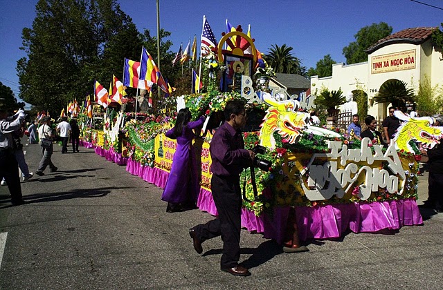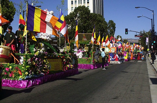 Trời hôm ấy thật đẹp, bầu trời quang đăng trong xanh, không khí mát mẻ trong lành, mọi người náo nức phấn khởi… Hơn 3 tiếng đồng hồ, đoàn xe hoa đi dạo quanh thành phố, đă được cộng đồng cùng dân bản xứ nghinh đón nồng hậu. Đoàn xe hoa chạy ngang đường Santa Clara rồi dừng lại ngay Ṭa Thị Chính San Jose. Đại diện cho ban tổ chức Phật Ngọc Ḥa B́nh cũng như đại diện cho thị trưởng của thành phố, họ có những lời chúc mừng tốt đẹp cho đại lễ. Đây cũng là biểu tượng cho t́nh đoàn kết giữa dân tộc Việt & các dân tộc bản xứ. Tiếp tục, đoàn xe hoa lại lăn bánh....Đi được một đoàn đường ngắn, đoàn xe phải dừng lại. Thật lạ lùng thay! Một sự huyền bí kỳ diệu, một đàn chim bồ câu sà xuống rồi lại bay lên cả mấy ṿng như nhảy múa, uốn lượn mừng vui quanh các xe hoa… Phải chăng những chú chim chim bồ câu đă mang đến một thông điệp của sự khát khao, ước vọng ḥa b́nh cho toàn thế giới! Đoàn xe đi đến đâu, mọi người hai bên đường đều chấp tay vái lạy niệm Phật. Họ hân hoan tôn kính. Họ trang nghiêm sùng bái. Những cụ già đầu tóc bạc phơ cũng có mặt từ lâu. Họ sung sướng v́ xúc động, những giọt nước mắt lăn dài trên hai g̣ má...miệng sóm sém reo ḥ:"Phật về rồi! Phật về rồi”.