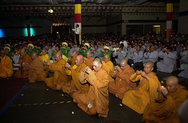 Cũng tại Hội Trường Phật Ngọc Ḥa B́nh, tối thứ bảy ngày 18 & tối chủ nhật ngày 19 tháng 9 năm 2010, đă tổ chức hai đêm dâng đèn; người Phật Tử thường gọi là:"Lễ Hội Hoa Đăng". Tôi và hai cháu đă đến sớm hơn giờ quy định. Các anh chị em trong ban tổ chức Phật Ngọc Ḥa B́nh đă có mặt đông đủ. Xen lẫn với những tà áo lam của những người con Phật Tử, những người ngoại đạo cũng v́ muốn đến chiêm bái Phật Ngọc mà họ đă đến đông nghẹt cả hội trường. Không khí càng trở nên nghiêm trang và ấm cúng. MC Nguyễn Hồng Dũng đă giới thiệu sơ qua về nghi lễ của buổi Dâng Đèn Hội Hoa Đăng.Tất cả mọi người đều im lặng, nghiêm chỉnh sắp hàng chuẩn bị làm lễ. Một vị Ḥa Thượng đă từ từ bước lên khán đài làm lễ tụng kinh tưởng niệm các vong hồn quá cố. Tiếng chiêng trống Bát Nhă vang lên những hồi linh thiêng...Giờ đây, cả không gian tràn ngập những ngọn nến. Những ánh nến bừng lên cháy rực như soi sáng những tâm tư của mỗi người. Với những ngọn nến yêu thương này, chúng con hăy thành kính dâng đến mười phương …Chư Phật chứng minh và soi hướng, các con hăy vững vàng đi theo những bước chân của Phât. Đó là những cảm nhận sâu sắc của chúng con qua lời Phật dạy, “Nam Mô Bổn Sư Thích Ca Mâu Ni Phật” tiếng cầu kinh vang lên gịn giả…Và Ḥa Thượng cũng cho biết thêm, những ai có mặt trong buổi Lễ Hội Hoa Đăng đều là nhân duyên, đó là duyên lành, duyên may th́ mới t́m đến Phật pháp. Buổi lễ không ngoài mục đích cầu nguyện cho các âm linh. Mọi người cầu nguyện cho các chiến sĩ Việt Nam Cộng Ḥa đă nằm xuống ngoài chiến trường v́ lư tưởng cao cả. Hăy cầu nguyện cho các anh hùng đă hy sinh trong các trại tù cải tạo. Mọi người cầu nguyện các vong linh vượt biển cả mênh mông hay bỏ ḿnh trong rừng núi hoang vu trên đường đi t́m tự do… Ḥa Thượng nhắc nhở các người con Phật Tử rằng chúng ta ăn quả phải nhớ kẻ trồng cây, uống nước phải nhớ công lao của người đào giếng…Tiếng cầu kinh lại vang lên lúc trầm, lúc bổng tạo nên một khúc nhạc du dương huyền bí…"Nam Mô A Di Đà Phật. Nam Mô Quan Thế Âm Bồ Tát. Nam Mô Thập Phương Thường Trú Tam Bảo…” Mọi người đều chăm chú niệm Phật, tụng kinh liên tục không ngớt... cầu nguyện cho thế giới an lành, thanh tâm an lạc. Nguyện sanh tây phương tịnh độ, chớ làm việc ác, hăy làm việc lành. Bao nhiêu tham hận sân si đều gạt bỏ. Hăy sống với: Từ- Bi- Hỉ- Xả. TỪ là từ tâm, là yêu thương, đem đến cho mọi người cùng hạnh phúc, thanh tâm an lạc. BI là lấy cái bi ra khỏi sự khổ đau, làm vơi đi nỗi khổ trong tâm hồn. Từ bi là đem lại hạnh phúc cho mọi người, là tháo gở những khúc mắc c̣n vương vấn lại trong ḷng. HỈ là niềm vui, dấu ấn của niềm vui là cả mọi người cùng hạnh phúc b́nh an. XẢ là không phân biệt khổ đau hay hạnh phúc tách rời từng người; mà tất cả tuy hai mà một, là sự ḥa hợp của mỗi con tim trong cùng một nhịp đập.