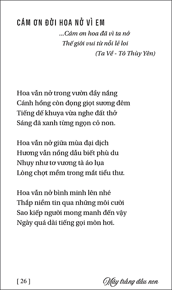 PHÁT HÀNH TÁC PHẨM THƠ MỚI: MÂY TRẮNG ĐẦU NON TẬP THƠ CỦA NGUYỄN AN BÌNH CŨNG LÀ TÁC PHẨM THỨ BA ĐƯỢC IN TRONG NĂM 2022(TÁC PHẨM THỨ 17 CỦA TỦ SÁCH TÌNH THƠ), NHÀ XUẤT BẢN HỘI NHÀ VĂN CẤP PHÉP 2022. SÁCH DÀY 178 TRANG VỚI HAI BÀI CẢM NHẬN TÁC PHẨM CỦA HAI NHÀ THƠ TRẦN HOÀNG VY VÀ NGUYỄN THÁNH NGÃ. SÁCH ĐÃ ĐƯỢC GIỚI THIỆU TRÊN FACEBOOK VÀ BLOG CỦA NGUYỄN AN BÌNH TỪ THÁNG TRƯỚC, ĐƯỢC MỘT SỐ BẠN BÈ VÀ THÂN HỮU ĐĂNG KÝ MUA ỦNG HỘ, NGAY KHI PHÁT HÀNH CHÚNG TÔI SẼ GỞI NGAY ĐẾN CÁC BẠN QUA ĐƯỜNG BƯU ĐIỆN. GIÁ GHI TRÊN SÁCH 120.000 ĐỒNG(KHÔNG PHÍ SHIP). BẠN BÈ VÀ THÂN HỮU TIẾP TỤC ỦNG HỘ MUA ĐỌC XIN GỞI TIỀN VÀO TÀI KHOẢN CỦA TÁC GIẢ: LƯƠNG MÀNH, SỐ TK: 007 100 1117229 NGÂN HÀNG VIETCOMBANK TP. HỒ CHÍ MINH(NAM SÀI GÒN) VÀ INBOX CHO HAY. SÁCH SẼ ĐẾN TẬN TAY CÁC BẠN. XIN CÁM ƠN CÁC BẠN VĂN RẤT NHIỀU.