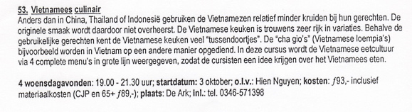 thiệu phong tục, văn hóa Việt Nam qua những món ăn. Cách tiếp cận và tổ chức khóa học Đương nhiên, trong phần giới thiệu gói gọn trong phạm vi một phần tư trang A4 của cuốn sách liệt kê các khóa học, tôi không thể ghi ra hết những mục đích này. Nhưng chỉ qua ít gịng giới thiệu, người đọc có thể thấy những ǵ họ thu được quá rẻ so với số tiền bỏ ra. Một khóa học kéo dài 4 hoặc 6 buổi tối, mỗi tuần một buổi, chỉ phải trả một số tiền khoảng từ 90 tới 120 gulden tùy theo khóa 4 buổi hay 6 buổi (gulden là đơn vị tiền tệ cũ của Ḥa Lan, khi thống nhất tiền Âu châu vào đầu năm 2002 th́ 1 euro tương đương 2,2 gulden). Học viên trên tuổi hưu c̣n được bớt 5% theo quy định của hội. Số tiền học phí này bao gồm mọi thứ: từ phương tiện pḥng ốc, bếp núc và luôn cả đồ ăn thức uống, kèm thêm một cuốn sách hướng dẫn. Và bảo đảm được ăn no bụng. C̣n ǵ hấp dẫn hơn?