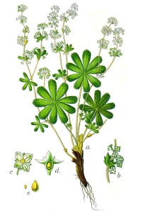 Gọi là Lady's mantle (Áo khoác thiếu phụ) vì loại cỏ này được dùng để trị các chứng bịnh phụ nữ. Tên khoa học là Achemilla alpina thuộc gia đình Rosaceae vì có gốc ở miền núi cao ở Âu Châu như núi Alpes, Pyrénées, miền nam Greenland (đảo to lớn ở đông bắc Canada thuộc chủ quyền của Đan Mạch). Cỏ trị bịnh phụ khoa cao từ 50- 60 cm. Năm (05) lá hay nhiều hơn tụ lại tạo thành hình ngôi sao 05 cánh hay nhiều cánh trông đẹp mắt. Lá màu xanh. Dưới lá có lông mịn. Hoa màu vàng- xanh không đẹp. Hoa kết thành chùm. Tên gọi thông thường: