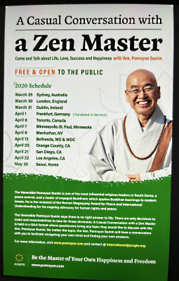 Lo âu cho tiền đồ đất nước, ḥa thượng thấy cần thoát ra khỏi đường hướng hoằng dương Phật pháp cổ điển, thầy mạnh dạn mở ra một Phật giáo mới, Phật giáo nhập thế, thành lập nhiều tổ chức xă hội hướng dẫn tuổi trẻ sống vui, sống mạnh. Thầy quan niệm phải t́m phương tiện đem giá trị ứng dụng của Phật pháp cho giới trẻ v́ pháp Phật không bao giờ lỗi thời. Hiệp Hội Junto Society (1) của thầy là một trong nhiều tổ chức đưa pháp Phật vào đời, giúp con người vượt qua được những vướng mắt, phiền năo của thế gian. Junto Society là một cộng đồng Phật tử tự nguyện thể hiện sự b́nh đẳng, sống đơn giản, thiểu dục tri túc, có khả năng chịu đựng để giải quyết các vấn nạn xă hội đưa đến sầu bi khổ u năo. Junto Society c̣n vươn tay giúp đỡ cho cộng đồng thế giới xóa đói giảm nghèo, hợp tác với Mạng Lưới Phật giáo quốc tế (INEB) có trụ sở ở Thái Lan. Ngày nay có hằng ngàn thanh niên nam nữ Đại Hàn gia nhập Junto Society, sống một đời sống dấn thân giúp đỡ kẻ khác, vị tha, an vui hạnh phúc, biết chia sẻ ngọt bùi với tha nhân v́ họ học được ở thầy là, “Our happiness is interconnected with that of Others!”
