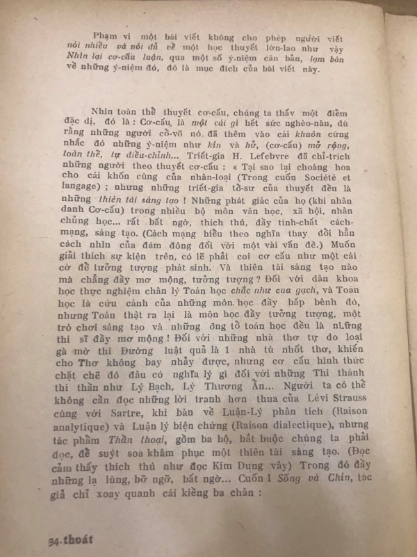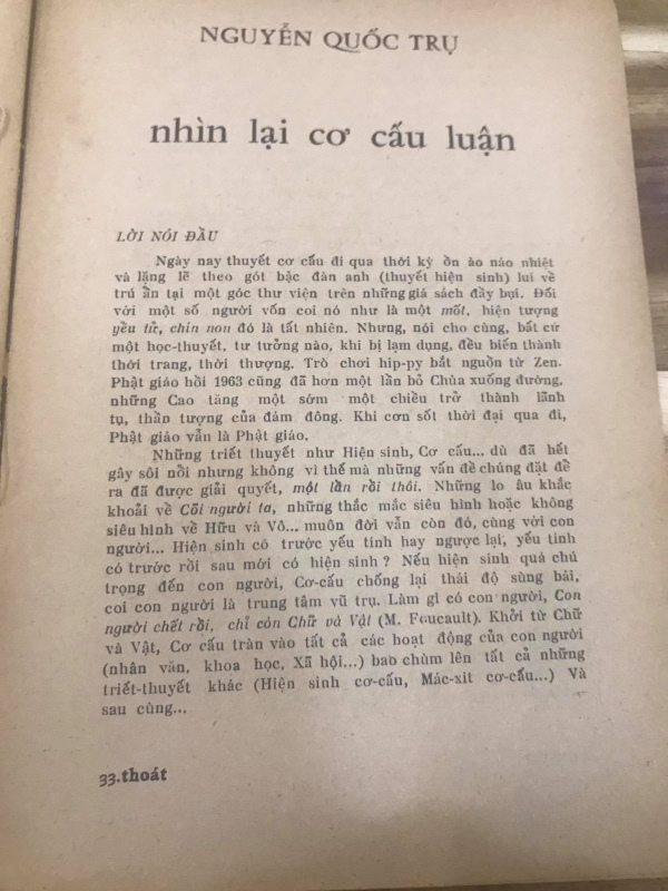 LỜI NÓI ĐẦU Ngày nay thuyết cơ cấu đi qua thời kỳ ồn ào náo nhiệt và lặng lẽ theo gót bậc đàn anh (thuyết hiện sinh) lui về trú ẩn tại một góc thư viện trên những giá sách đầy bụi. Đối với một số người vốn coi nó như là một mốt, hiện tượng yểu tử, chín non đó là tất nhiên. Nhưng, nói cho cùng, bất cứ một học-thuyết, tư tưởng nào, khi bị lạm dụng, đều biến thành thời trang, thời thượng. Tṛ chơi hip-py bắt nguồn từ Zen, Phật giáo hồi 1963 cũng đă hơn một lần bỏ Chùa xuống đường, những Cao tăng một sớm một chiều trở thành lănh tụ, thần tượng của đám đông. Khi cơn sốt thời đại qua đi, Phật giáo vẫn là Phật giáo. Những triết thuyết như Hiện sinh, Cơ cấu... dù đă hết gây sôi nổi nhưng không v́ thế mà những vấn đề chúng đặt để ra đă được giải quyết, một lần rồi thôi. Những lo âu khắc khoải về Cơi người ta, những thắc mắc siêu h́nh hoặc không siêu h́nh về Hữu và Vô... muôn đời vẫn c̣n đó, cùng với con người... Hiện sinh có trước yếu tính hay ngược lại, yếu tính có trước rồi sau mới có hiện sinh ? Nếu hiện sinh quá chú trọng đến con người, Cơ-cấu chống lại thái độ sùng bái, coi con người là trung tâm vũ trụ. Làm ǵ có con người, Con người chết rồi, chỉ c̣n Chữ và Vật (M. Foucault). Khởi từ Chữ và Vật, Cơ cấu tràn vào tất cả các hoạt động của con người (nhân văn, khoa học, xă hội...) bao chùm lên tất cả những triết-thuyết khác (Hiện sinh cơ-cấu, Mác-xít cơ-cấu...) Và sau cùng... Phạm vi một bài viết không cho phép người viết nói nhiều và nói đủ về một học thuyết lớn-lao như vậy. Nh́n lại cơ- cấu luận, qua một số ư.niệm căn bản, lạm bàn về những ư-niệm đó, đó là mục đích của bài viết này.