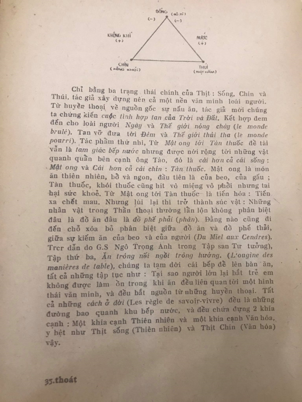 Chỉ bằng ba trạng thái chính của Thịt: Sống, Chín và Thúi, tác giả xây dựng nên cả một nền văn minh loài người. Từ huyền thoại về nguồn gốc sự nấu ăn, tác giả mời chúng ta chứng kiến cuộc t́nh hợp tan của Trời và đất. Kết hợp đem đến cho loài người Ngày và Thế giới nóng cháy (le monde brulé). Tan vỡ đưa tới Đêm và Thế giới thúi tha (le monde pourri). Tác phẩm thứ nh́, Từ Mật ong tới Tàn thuốc đề tài vẫn là tam giác bếp nước nhưng được nới rộng tới những vật quanh quẩn bên cạnh ông Táo, đó là cái hơn cả cái sống : Mật ong và Cái hơn cả cái chín : Tàn thuốc. Mật ong là món ăn thiên nhiên, bổ và ngon, đầu tiên là của beo, của gấu ; Tàn thuốc, khói thuốc cũng hít vô miệng vô phổi nhưng tại hại sức khoẻ. Từ Mật ong tới Tàn thuốc là tiến hóa: Tiến xa chết mau. Nhưng lùi lại th́ trở thành súc vật : Những nhân vật trong Thần Thoại thường lẫn lộn không phân biệt đâu là đồ ăn, đâu là đồ phế thải (phân). Đằng nào cũng đi đến chỗ xóa bỏ phân biệt giữa đồ ăn và đồ phế thải, giữa sự kiếm ăn của beo và của người (Du Miel aux Cendres) (Trích dẫn do G.S Ngô Trọng Anh trong Tập san Tư Tưởng). Tập thứ ba, Ăn trông nồi ngồi trông hướng (L'origine des manières de table), chúng ta tạm dời cái bếp để lên bàn ăn, tất cả những tập tục như: Tại sao người lớn lại bắt trẻ em không được làm ồn trong khi ăn đều liên quan tới một h́nh thái văn minh, và đều bắt nguồn từ những huyền thoại. Tất cả những cách ở đời (Les règle de savoir-vivre) đều là những đường bao quanh khu bếp nước, và đều chứa đựng 2 khía cạnh: Một khía cạnh Thiên nhiên và một khía cạnh Văn hóa, y hệt như Thịt sống (Thiên nhiên) và Thịt Chín (Văn hóa) vậy. Ai cũng là độc giả của bộ Thần Thoại được. Bộ sách đó không phải dành riêng cho những triết gia hoặc những nhà khảo cứu. Tương tự như tiểu thuyết chưởng của KD : Đọc giải trí cũng được và trong khi giải trí khám phá ra một vài ư nghĩa thâm trầm, càng hay ! Đó là về phần Levi Strauss. Tác phẩm của M. Foucault đại chúng không đọc được. Và ngay cả những bậc trí thức cũng ít người đọc, 1 phần v́ thiên kiến, nghe nói tới Cơ cấu là lắc đầu rồi, như xưa kia nghe nói tới Hiện sinh vậy.