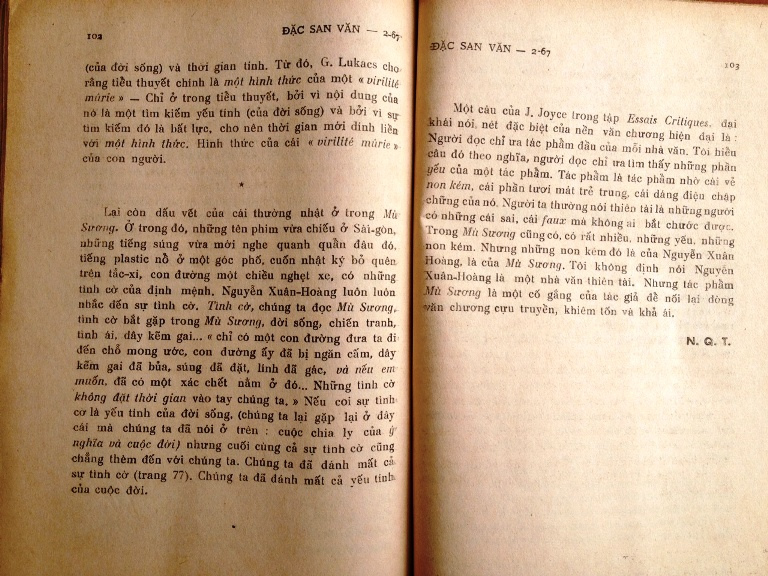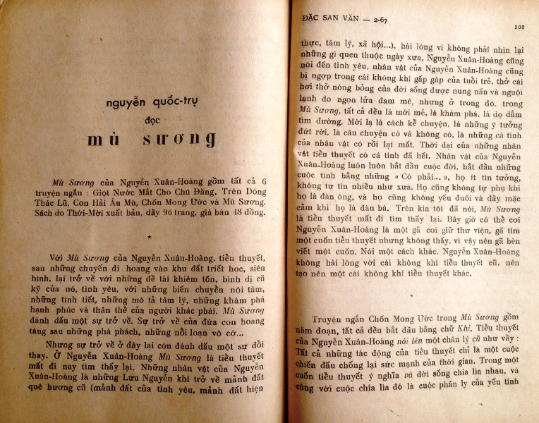 ~~000~~ Mù Sương của Nguyễn Xuân-Hoàng gồm tất cả 6 truyện ngắn : Giọt Nước Mắt Cho Chú Đăng, Trên Ḍng Thác Lũ, Con Hải Âu Mù, Chốn Mong Ước và Mù Sương. Sách do Thời-Mới xuất bản, dày 96 trang, giá bán 18 đồng. *** Với Mù Sương của Nguyễn Xuân-Hoàng, tiểu thuyết, sau những chuyến đi hoang vào khu đất triết học, siêu h́nh, lại trở về với những đề tài khiêm tốn, b́nh dị cũ kỹ của nó, t́nh yêu, với những biến chuyển nội tâm, những t́nh tiết, những mô tả tâm lư, những khám phá hạnh phúc và thân thể của người khác phái. Mù Sương đánh dấu một sự trở về. Sự trở về của đứa con hoang tàng sau những phá phách, những nỗi loạn vô cớ... Nhưng sự trở về ở đây lại c̣n đánh dấu một sự đổi thay. Ở Nguyễn Xuân-Hoàng Mù Sương là tiểu thuyết mất đi nay t́m thấy lại. Những nhân vật của Nguyễn Xuân-Hoàng là những Lưu Nguyễn khi trở về mảnh đất quê hương cũ (mảnh đất của t́nh yêu, mảnh đất hiện thực, tâm lư, xă hội...), hài ḷng v́ không phải nh́n lại những ǵ quen thuộc ngày xưa. Nguyễn Xuân-Hoàng cũng nói đến t́nh yêu, nhân vật của Nguyễn Xuân-Hoàng cũng bị ngợp trong cái không khí gấp gáp của tuổi trẻ, thở cái hơi thở nóng bỏng của đời sống được nung nấu và nguội lạnh do ngọn lửa đam mê, nhưng ở trong đó, trong Mù Sương, tất cả đều là mới mẻ, là khám phá, là dọ dẫm t́m đường. Mới lạ là cách kể chuyện, là những ư tưởng đứt rời, là câu chuyện có và không có, là những cá tính của nhân vật có rồi lại mất. Thời đại của những nhân vật tiểu thuyết có cá tính đă hết. Nhân vật của Nguyễn Xuân Hoàng luôn luôn bắt đầu cuộc đời, bắt đầu những cuộc t́nh bằng những « Có phải... " Họ ít tin tưởng, không tự tín nhiều như xưa. Họ cũng không tự phụ khi họ là đàn ông, và họ cũng không yếu đuối và đầy mặc cảm khi họ là đàn bà. Trên kia tôi đă nói, Mù Sương là tiểu thuyết mất đi t́m thấy lại. Bây giờ có thể coi Nguyễn Xuân-Hoàng là một gă coi giữ thư viện, gă t́m một cuốn tiểu thuyết nhưng không thấy, v́ vậy nên gă bèn viết một cuốn. Nói một cách khác, Nguyễn Xuân-Hoàng không hài ḷng với cái không khí tiểu thuyết cũ, nên tạo nên một cái không khí tiểu thuyết khác. *** Truyện ngắn Chốn Mong Ước trong Mù Sương gồm năm đoạn, tất cả đều bắt đầu bằng chữ Khi. Tiểu thuyết của Nguyễn Xuân-Hoàng nói lên một chân lư cũ như vầy: Tất cả những tác động của tiểu thuyết chỉ là một cuộc chiến đấu chống lại sức mạnh của thời gian. Trong một cuốn tiểu thuyết ư nghĩa và đời sống chia ĺa nhau, và cùng với cuộc chia ĺa đó là cuộc phân ly của yếu tính (của đời sống) và thời gian tính. Từ đó, G. Lukacs cho rằng tiểu thuyết chính là một h́nh thức của một " virilité mûrie " - Chỉ ở trong tiểu thuyết, bởi v́ nội dung của nó là một t́m kiếm yếu tính (của đời sống) và bởi v́ sự t́m kiếm đó là bất lực, cho nên thời gian mới dinh liền với một h́nh thức. H́nh thức của cái " virilité mûrie " của con người. *** Lại c̣n dấu vết của cái thường nhật ở trong Mù Sương. Ở trong đó, những tên phim vừa chiếu ở Sài-g̣n, những tiếng súng vừa mới nghe quanh quẩn đâu đó, tiếng plastic nổ ở một góc phố, cuốn nhật kư bỏ quên trên tắc-xi, con đường một chiều nghẹt xe, có những t́nh cờ của định mệnh. Nguyễn Xuân-Hoàng luôn luôn nhắc đến sự t́nh cờ. T́nh cờ, chúng ta đọc Mù Sương, t́nh cờ bắt gặp trong Mù Sương, đời sống, chiến tranh, t́nh ái, dây kẽm gai... " chỉ có một con đường đưa ta đi đến chỗ mong ước, con đường ấy đă bị ngăn cấm, dây kẽm gai đă bủa, súng đă đặt, lính đă gác, và nếu em muốn, đă có một xác chết nằm ở đó... Những t́nh cờ không đặt thời gian vào tay chúng ta. " Nếu coi sự t́nh cờ là yếu tính của đời sống, ( chúng ta lại gặp lại ở đây cái mà chúng ta đă nói ở trên : cuộc chia ly của ư nghĩa và cuộc đời) nhưng cuối cùng cả sự t́nh cờ cũng chẳng thèm đến với chúng ta. Chúng ta đă đánh mất cả sự t́nh cờ (trang 77). Chúng ta đă đánh mất cả yếu tính của cuộc đời. ***