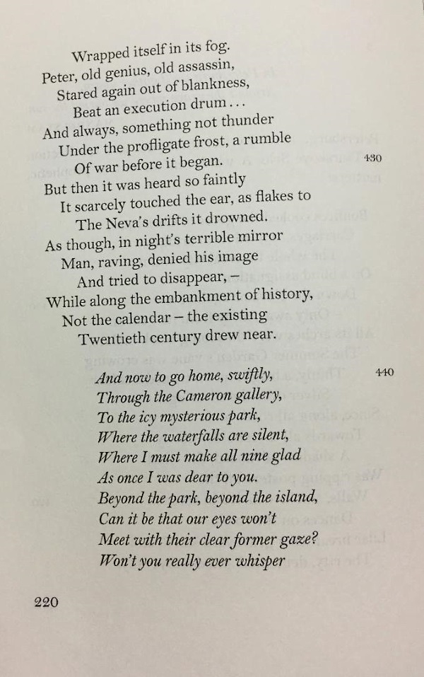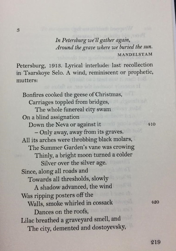 Carriages toppled from bridges, The whole funereal city swam On a blind assignation Down the Neva or against it — Only away, away from its graves. All its arches were throbbing black molars, The Summer Garden's vane was crowing Thinly, a bright moon turned a colder Silver over the silver age. Since, along all roads and Towards all thresholds, slowly A shadow advanced, the wind Was ripping posters off the Walls, smoke whirled in cossack Dances on the roofs, Lilac breathed a graveyard smell, and The city, demented and dostoyevsky, Wrapped itself in its fog. Peter, old genius, old assassin, Stared again out of blankness, Beat an execution drum ... And always, something not thunder Under the profligate frost, a rumble Of war before it began. But then it was heard so faintly It scarcely touched the ear, as flakes to The Neva's drifts it drowned. As though, in night's terrible mirror Man, raving, denied his image And tried to disappear, — While along the embankment of history, Not the calendar — the existing Twentieth century drew near.