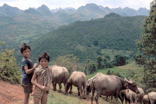 Trẻ chăn trâu Cao Bằng. Nguồn: caobangtv.gov.vn Nhưng đói khổ thòm thèm nên chú nào cũng mắc bệnh ăn vụng. Ăn vụng từ củ khoai đến xương gà rô ti do dì Xinh giúi cho. Đói quá nên gặp gì ăn nấy, cái gì có thể ăn cắp được thì ăn cắp chẳng còn biết sợ cha, sợ tội là gì nữa. Trong bốn chú, hầu như người nào cũng bị phù thũng, mặt xanh bủng, hơi thở nặng nhọc, hai mắt nhấp nhánh liên hồi như có châm kim, lửa đốt. Dì Xinh đặc biệt thương tôi nên thường giúi vào tay tôi khi miếng thịt gà, hoặc bò, khi nắm xôi. Gặp tôi là Dì Xinh nhoét ra cười, nghẻo cái đầu một cái rồi mới đi. Những khi rỗi rảnh, dì đòi xem bàn tay tôi vì thấy mịn trắng và đẹp. Dì ngây thơ kêu ”Gì mà trắng ngần”. Rồi lại cười. Dì thích hát bài "Mà u sơ kưa, U sưa ku la". Giọng trong và lơ lớ, ngứt đọan nửa chừng. Những lúc đó, tôi thấy dì thật sung sướng.