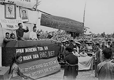 địa chủ bị đấu gục. Ảnh: Nhiếp ảnh gia Liên Xô Ngày 12/4/1953 Hồ Chí Minh ban hành Sắc lệnh số 150 SL về Cải cách ruộng đất, tịch thu ruộng đất của thực dân Pháp và địa chủ phản động chia lại cho nông dân nghèo. Ngày 14/11/1953, Hội nghị lần thứ 5 Ban Chấp hành Trung ương và Hội nghị toàn quốc của Đảng Lao động đă quyết định tiến hành CCRĐ. Trong báo cáo trước Quốc hội khoá I kỳ họp lần thứ ba, ông Hồ đă phát biểu "Phương châm của cải cách ruộng đất là: phóng tay phát động quần chúng nông dân" (Hồ Chí Minh Toàn tập, tập 6 trang 509). Ông Nguyễn Văn Trấn, nguyên Đại biểu Quốc hội khoá I, đại diện Sài G̣n Chợ Lớn, giải thích "phóng tay" nghiă là "cứ việc làm mạnh thả cửa" (Nguyễn Văn Trấn, trang 266). Ông Nguyễn Minh Cần giải thích "là làm hết sức mănh liệt, thẳng tay, không khoan nhượng, không thương xót, cho dù quá trớn, quá tả cũng không đáng sợ". Ông c̣n cho biết: "Ông Hồ đă dùng h́nh ảnh dễ hiểu: khi uốn thanh tre cong cho nó thẳng ra, phải uốn quá đi một tí và giữ lâu lâu, rồi thả tay ra th́ nó mới thẳng được". Ông Nguyễn Văn Trấn than rằng "Trời ơi! Đảng của tôi đă nghe lời người ngoài, kéo khúc cây cong quá trớn. Nó bật lại giết chết bao nhiêu vạn sinh linh." (Nguyễn Văn Trấn, trang 266).