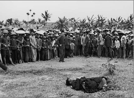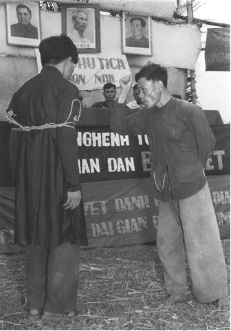 đấu tố địa chủ - Ảnh: Nhiếp ảnh gia Liên Xô Cuộc CCRĐ diễn ra khi người dân chưa kịp hoàn hồn sau 10 năm chiến tranh chống Pháp. Với chủ thuyết đấu tranh giai cấp, biến toàn dân thành kẻ bần cùng vô sản, t́nh tự dân tộc, giềng mối xă hội chỉ một sớm một chiều đă hoàn toàn tan ră. Truyền thống đạo đức, nhân từ bị thay thế bằng hận thù, bạo lực, khủng bố. Từ những ngày đầu của phong trào “Xô Viết Nghệ Tĩnh”, người dân quê tôi đă chứng kiến những tốp năm, bảy người lạ mặt đến tận thôn xóm, vào những gia đ́nh thân hào, trí thức, những nhà có của, bắt chủ nhà ra trói lại, quấn giẻ vào bàn chân, tẩm dầu hôi đốt để khảo của. Suốt dọc dài cuộc chiến từ 1945 đến 1954 hầu như thường xuyên xẩy ra những vụ ban đêm có người gơ cửa lôi chủ nhà ra ngoài đồng ruộng, bụi bờ dùng mă tấu chém hoặc dùng vồ đập chết, về sau th́ xử bắn công khai với bản án “việt gian phản động”. Năm 1930 bố tôi 18 tuổi, tuổi thanh niên tràn đầy nhiệt huyết, ḷng yêu nước nồng nàn, gia nhập đảng CS Đông Dương, Bí thư Chi Bộ xă. Sau một thời gian hoạt động, chứng kiến các vụ ám sát, thủ tiêu những người vô tội, những vụ khủng bố, khảo của lương dân, ông ly khai đảng. Khi chi bộ đảng tan ră, ông ra làm Phó Lư để tránh bị bắt bớ. Sau tháng tám 1945, ông hoạt động trong Hội đồng Nhân dân và UBKC Hành Chánh, Mặt Trận Liên Việt xă, thư kư Hội Thân Hào, Uỷ viên Liên Việt huyện, chủ tịch Liên Việt Xă nhưng không gia nhập đảng Lao động. Năm 1953, từ trụ sở Liên Việt, ông bị đưa về tập trung tại sân trường tiểu học Thượng B́nh cùng với năm người khác, trong số có ông Vơ Tá Tân, Hoàng Công Phu là hai bạn thân của bố tôi. Những người này được tuyên bố là thành phần có tội với nông dân, bị quản chế tại địa phương, tạm thời cho về nhà nhưng không ai được đi ra khỏi địa phương. Riêng ông Vơ Tá Tân bị bắt đem đi. Mấy tháng sau, một “ṭa án nhân dân đặc biệt”, thiết lập trên một ngọn đồi hoang vào ban đêm. Dân trong làng xă phải tới dự, kể cả những gia đ́nh đă bị quy là địa chủ, phú nông. Nạn nhân bị tuyên án tử h́nh. Bản án thi hành tại chỗ. Nạn nhân bị lôi đi một quăng, bị trói cặp vào chiếc cọc tre đă dựng sẵn, mấy phát súng nổ lạc lơng giữa màn đêm đen kịt, người anh của nạn nhân tên là Vơ Tá Thiều la lên một tiếng liền bị bắt trói, dẫn đi. Cả không gian nín lặng. Mùi tử khí rợn người. Đêm hôm đó tôi đi theo một người bạn học, thành phần bần cố nông, tên là Tùng để được Tùng che chở. Lần thứ hai trong đời, tôi lại nghe hai tiếng tử h́nh, hai người bị giết cùng họ Vơ Tá. Tôi nổi da gà, run sợ, nắm chặt tay người bạn, lặng người nghe những phát súng bắn vào người bạn của bố ḿnh, người mà tôi đă từng nhiều lần theo bố tôi đến nhà chơi, được ông bà thương mến. (Sau năm 1975, người con trai của ông Vơ Tá Tân là Vơ Tá Long cùng vợ con từ Hà Tĩnh vào định cư tại vùng kinh tế mới Xuân Sơn, tỉnh Bà Rịa, khai hoang làm rẫy). Cuộc thanh trừng giai cấp này mở đầu phong trào Cải cách Ruộng đất tại xă, huyện quê tôi. Ông Vơ Tá Tân là người địa chủ đầu tiên bị bắn mà không qua những lần đấu tố như các địa chủ khác sau đó. Bố tôi, sau khi bị triệu đi “học tập” và khai báo ba tháng, được thả về địa phương chờ nhân dân xử tội. Khẩu hiệu mà “đội cải cách” truyền đạt mệnh lệnh cho đám bần cố nông là: “Địa chủ hết thời, nông dân vạn đại. Có khổ tố khổ. Ngồi tố, đi tố, đứng tố, đi đâu tố đó. Đào tận gốc trốc tận rễ...”. Những gia đ́nh cḥm xóm, láng giềng mới hôm qua, hôm trước tối lửa tắt đèn có nhau, chia nhau từng miếng trầu, đĩa dưa, nắm muối, bỗng trở nên là kẻ tử thù, không đội trời chung! Những người dân quê mộc mạc không biết tố, không t́m ra tội ác địa chủ, ông đội mớm cho những loại “tội ác tày trời” mà nông dân không tưởng tượng ra được. Người dân quê phần đông chân chất, ít thủ đoạn, bịa đặt những chuyện không tưởng. Tất cả tội trạng địa chủ đều do Đội Cải cách biên soạn thành những bài học, những khẩu hiệu rèn luyện, ép buộc người dân quê phải nghe theo, nói theo. Ở quê tôi, không có báo chí và thời kỳ ấy cũng chưa có loa phóng thanh nên phương tiện “truyền thông” chỉ là hội họp. Họp liên miên hàng đêm, họp quảng đại mọi thành phần, hoặc họp riêng nông dân cốt cán. Tội ác địa chủ do “ông đội” nghĩ ra và mớm cho đám bần cố nông. - “Chị c̣n nhớ tên địa chủ K không? Nó đă từng nhét con mèo vào miệng chị Út bắt nuốt, chỉ v́ nó nghi chị Út ăn cắp mấy trái bắp giống của nhà nó. Chị đă từng làm thuê cho nhà nó nhiều năm, chị chưa bị nó nhét mèo vào miệng chị hay sao?” Thế là giữa đấu trường sau đó một người đàn bà nhảy lên chỉ vào mặt ngư