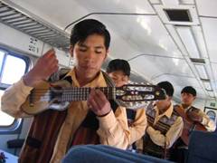Tôi đă gặp các bạn trẻ này. Họ rất trẻ, tương lai c̣n rất dài trước mặt . Họ gặp nhau và thành lập một băng nhạc dạo, lưu động theo các chuyến xe lửa từ Puno đến Cusco và ngược lại. Hát dạo là một nghề kiếm sống khó khăn, nhưng các bạn trẻ này vẫn phấn đấu, mang tiếng hát, tiếng đàn lại cho hành khách đỡ chán trên một chuyến đường dài hơn 10 tiếng đồng hồ, đồng thời cũng là cơ hội để các bạn trẻ tự tiếp thị sản phẩm của ḿnh: các CD do họ tự sản xuất. Nh́n họ tôi thật thương và cảm phục biết bao! Con đường học vấn cao hơn chưa mở cửa cho họ, nhưng họ không chán nản cũng chẳng bi quan. Họ chấp nhận hoàn cảnh nhưng không đầu hàng số phận, và không bỏ lỡ cơ hội ǵn giữ tài năng, cho dù đó là khả năng phụ . Các bạn trẻ này đă vui ḷng nói chuyện với tôi, chỉ cho tôi coi cái đàn charango. Tôi hỏi một du khách Mỹ về cái đàn này, họ gọi nó là Small Guitar, song tôi không nghĩ nó là ghi ta. Đàn có năm nhóm dây, mỗi nhóm hai sợi, dây chính mang tên sol do mi la mi . Cũng qua họ tôi t́m thấy một loại đàn khác, rất phổ biến trong dân gian Peru, có tên banjodolin.