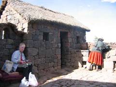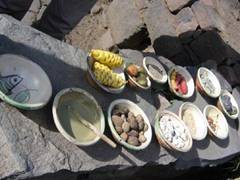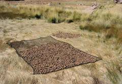Những người dân miền núi này sinh sống bằng trồng trọt, mỗi gia đ́nh có một mảnh đất và canh tác các loại nông sản như khoai tây, băp. Người ta cho biết, trước đây, vào thời đại Inka, có ít nhất là năm ngàn loại khoai tây khác nhau, nhưng lần lần bị mất giống, đến nay chỉ c̣n khỏan một ngàn rưỡi loại. (Tôi cảm thấy nghi ngờ về số lượng chủng loại khoai tây này lăm, nhưng tra cứu thêm trong wikipedia th́ thấy có 4000 loại, khoai lang có 2016, bắp: 35, cá: 2000, trái cây: 650 – http://en.wikipedia.org/wiki/Peruvian_Cuisine ). Cũng theo tự điển wikipedia th́ khoai tây đă được trồng ở vùng núi cao phía nam rặng Andes từ bảy ngàn năm trước. Nó được trồng ở khu vực này v́ khí hậu qúa lạnh không thích hợp cho việc trồng băp. Nó là lương thực chính của người dân ở đây và chỉ được giới thiệu cùng thế giới sau khi người Châu Âu đặt chân lên Nam Mỹ Châu. Tôi chỉ đủ th́ giờ và bụng để nếm thử hai loại khoai tây và một loại khoai lang do cư dân địa phương đăi. Củ nhỏ, chăc thịt mà dẻo, ăn lúc đói bụng cũng ngon đáo để. Họ cũng có kỹ thuật làm khoai tây khô bằng cách phơi năng gió và cả sương đêm. Khi khô củ khoai tây có màu trắng và xốp, nhẹ hơn khoai tươi rất nhiều. Muốn nấu khoai tây khô phải ngâm chúng vào nước cả tiếng đồng hồ rồi nấu thêm vài tiếng nữa mới đủ mềm để ăn. Đặc biệt người dân ở làng này c̣n nấu một loại xốt từ đá , tôi không nhớ rơ tên của loại đá này (xem h́nh), tôi lấy một ít, thử đem rửa nước lạnh th́ nó mềm và bể vụn ra.