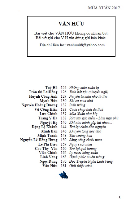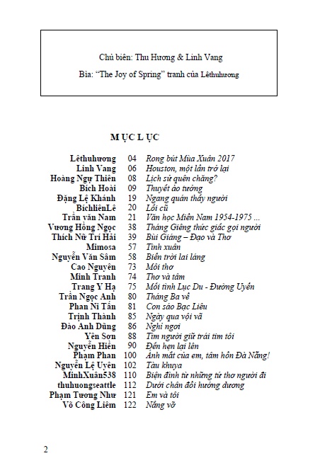 THU HƯƠNG: RONG BÚT / Ở BẮC LỤC ĐỊA MỸ CHÂU LINH VANG: HOUSTON MỘT LẦN TRỞ LẠI VƯƠNG HỒNG NGỌC: THÁNG GIÊNG THỨC GIẤC GỌI NGƯỜI / DỖ GIẤC TRẦN THỊ LAIHỒNG: T̀NH BẤT TẬN