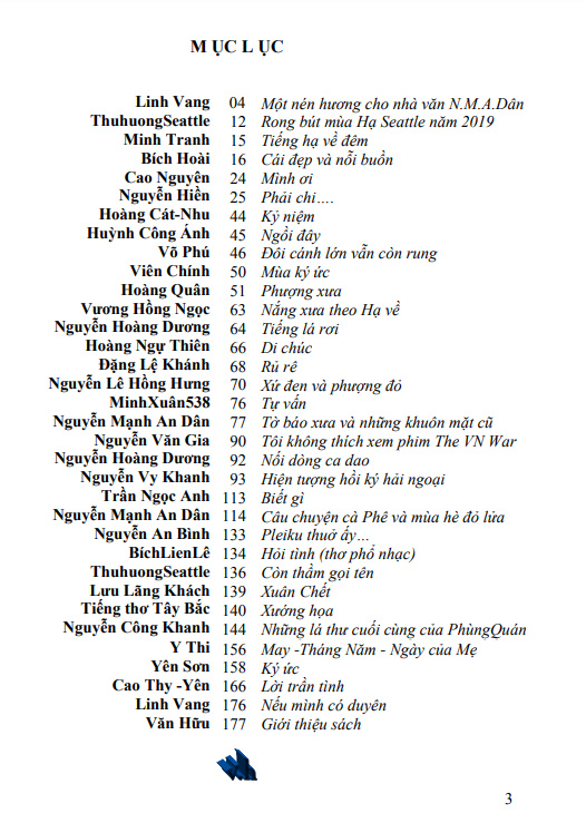 LINH VANG: MỘT NÉN HƯƠNG CHO NHÀ VĂN NGUYỄN MẠNH AN DÂN THUHUONGSEATTLE VÀ RONG BÚT HẠ 2019 BÍCH HOÀI: CÁI ĐẸP VÀ NỖI BUỒN VƠ PHÚ: ĐÔI CÁNH LỚN VẪN C̉N RUNG BICHLIEN LÊ / LIÊN B̀NH ĐỊNH: HỎI T̀NH NGUYỄN MẠNH AN DÂN: TỜ BÁO XƯA VÀ NHỮNG KHUÔN MẶT CŨ