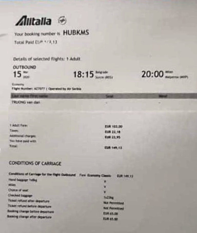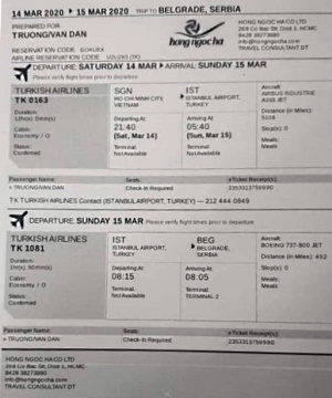 Nhưng chuyến này bay vào ngày thứ 3, tuần sau, tôi thấy ḿnh không thể chờ đến đó, ai biết sẽ có bao nhiêu việc bất ngờ xảy ra nữa. Chỉ ngồi chờ mà đầu óc tôi căng thẳng thế này rồi. Tôi tính thầm và quyết định là nếu bay được th́ phải trong tuần này, nếu không được th́ đành chịu. Cuối cùng Huyền thông báo chuyến bay khác, bay ngay trong đêm thứ 7, 14/3 , và tôi đang ở tại sân bay Tân Sơn Nhất nên có thể làm thủ tục ngay. Mừng quá, tôi và Thịnh kéo hành lư đến quầy ngay v́ sợ trễ giờ. Chuyến bay này bay ḷng ṿng với Turkish airline, từ Sài G̣n bay qua Istanbul, rồi từ Istanbul quá cảnh ở Belgrade (Serbia) và từ đó đổi sang hăng Alitalia để tiếp tục bay về Milan. Như vậy th́ hành lư chỉ được kư gửi đến Belgrade, nghĩa là đến đó tôi nhập cảnh vào Serbia để ra nhận hành lư rồi lại làm thủ tục nhập cảnh để kư gửi với Alitalia và bay về Milano! Tưởng như may mắn đă mỉm cười v́ sắp được bay, nhưng khi làm thủ tục th́ nhân viên cho biết là không thể v́ vừa có lệnh cấm người mang hộ chiếu Italy vào Serbia. Và một lần nữa, lại không thể bay. Tôi ngồi thụp xuống v́ thất vọng. Nhưng khi b́nh tĩnh th́ tôi xác định là trong tuần này khi lệnh cấm chưa thực sự siết chặt th́ vẫn có cửa đi được. Phải t́m cách khởi hành vào ngày thứ bảy hay chậm nhất là chủ nhật 15/2 v́ thứ hai tuần sau các sân bay ở Ư và Âu châu sẽ có thể bị phong toả. V́ thế tôi không về nhà ngay mà ngồi nán lại sân bay và nhờ Huyền t́m giúp một chuyến bay khác ngay trong đêm. Sau đó có mấy đề nghị khác nhưng bay ṿng vèo hay lộ tŕnh không hợp lư nên tôi không đồng ư và ngồi chờ các đường bay khác. Nga em gái từ QN gọi hỏi thăm, tôi chỉ biết nói là đang chờ chứ không biết nói ǵ thêm. Được? không được? Ai biết ra sao sau vài giờ nữa. Các bạn tôi Hoàng Kim Oanh, Mỹ Lệ, Đặng Châu Long, Nguyên Cẩn liên tục nhắn tin hỏi thăm. Cảm động nhất là Quynh Iris de Prell, cô em gái chỉ quen trên FB, chưa gặp mặt lần nào mà mấy ngày trước luôn nhắn tin thăm hỏi và động viên tinh thần. Tôi càng hiểu thêm giá trị của t́nh người và kết nối của văn chương. Cuộc điện thoại bất ngờ nhất là của cô ba tôi, 95 tuổi, thăm hỏi và nói quyết định bay về Ư của tôi là đúng t́nh đúng nghĩa, nguy hiểm th́ phải cẩn thận chứ không thể bỏ Elena, người trọn đời hy sinh cho tôi, một ḿnh trong lúc này. Cô nói cô thương quư Elena lắm và cầu mong là chuyến đi sẽ an toàn. Tôi vô cùng cảm động. Chắc rồi Tuyết Nga sẽ báo cho các em bên Australia, Hoàng Kim Oanh sẽ báo cho các bạn trong nhóm Quán Văn… Bạn bè và người thân đang theo dơi từng bước… nên tôi phải có trách nhiệm thông tin khi thực sự chắc chắn và không được để mọi người mừng hụt hay lo lắng. Tuy tôi bay một ḿnh mà không đơn độc. Linh tính c̣n báo cho tôi biết là ḿnh sẽ bay về được. Đến 10h30 sốt ruột, tôi gọi và Huyền nói anh cứ chờ thêm một lát nữa, em và một nhân viên đang t́m, nếu có chuyến là bay luôn khỏi về nhà rồi mất công lên lại. Chờ măi đến gần nửa đêm, sân bay lúc này vắng hoe, Huyền gọi điện khuyên tôi về nhà nghỉ ngơi, c̣n cô và nhân viên tên Được sẽ thức t́m , sẽ báo ngay khi có vé. Tôi về nhà, cơ thể bất động, ră rời, nhưng đầu óc cứ tiếp tục lo nghĩ. Đó thực là một đêm ác mộng và giấc ngủ chập chờn chỉ do mệt mỏi. 9h sáng ngày hôm sau Huyền thông báo có chuyến bay trong ngày15/3, nghĩa là đi trước 1 ngày so với các chuyến trước: Từ Saigon bay qua Doha (Qatar), rồi từ Doha để về Roma. Từ Roma anh có thể về nhà ở Milano được không, v́ không t́m được chuyến bay nào từ Roma về Milano cả, chỉ có một chuyến mà rất bất tiện v́ phải bay ṿng với 2 trạm dừng. Tôi mừng rỡ: được! được! bay đến Roma là OK rồi! Lúc này tôi mới vỡ lẽ là với t́nh h́nh dịch bệnh kinh khủng như thế ở miền Bắc Ư nên các hăng hàng không không bay về Milano. Thế mà 2 hôm nay ḿnh cứ khư khư đ̣i bay về Milano nên không t́m được vé. Mà đến Roma là đến Ư rồi, đến nhà rồi, tôi có nhiều cách để về Milano mà cách hay nhất là đi tàu lửa cao tốc. Huyền gửi ngay lộ tŕnh: Sunday 15 March 2020 QR 971 19:15 Ho Chi Minh City, Arrival 15 March 23:45 Doha, (Hamad International) (+) Duration 08:30 Equipment BOEING 777-300ER Flight meal Meal . Monday 16 March 2020 QR 131 Departure 16 March 08:45 Doha, (Hamad International) (+) Arrival 16 March 12:55 Rome, (Fiumicino) (+) Duration 06:10 Equipment BOEING 777-300ER Flight meal Meal Thế là xuất vé ngay. Nhưng tối bay mà đến 12h trưa Thịnh vẫn không làm checkin online được. Lo. Loay hoay măi mới xong. Lúc này chuyện bất thường nhỏ nào cũng làm tôi thót tim. Tôi vào mạng xem và mua vé tàu cao tốc để từ Roma về Milano. Tuy đă ổn nhưng ḷng tôi vẫn thấp thỏm, không yên. Đă mấy lần bị hủy vé vào giờ phút chót nên tôi dặn ḿnh không mừng vội, cũng chưa dám báo tin cho Elena hay bạn bè. Khoảng 3h chiều Tuyết gọi thăm và tôi nói nếu mu