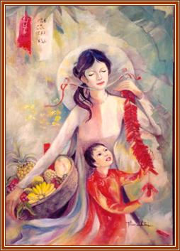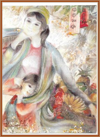 Theo mẹ đi chợ Tết Tranh màu nước - silk painting Artist Thanh Tri