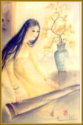 Tiếng đàn ngày xuân. Water color on silk Artist Thanh Tri