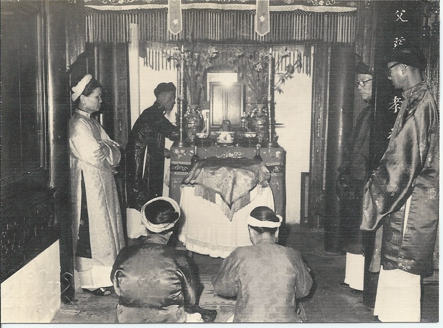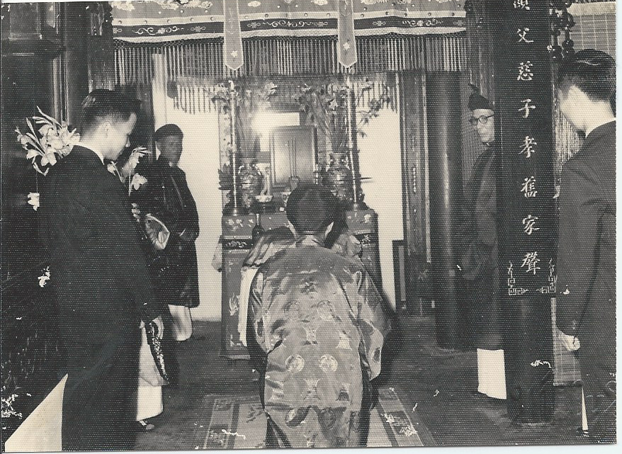 Sau đó Huyên lạy gia tiên, sau lưng có hai anh phụ rể.