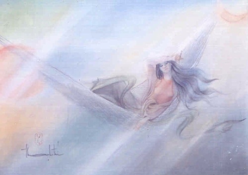 In Thời gian và Không Gian, ‘Time and Space’, the work is marked with a shimmering rose morning light against the lingering darkness of night, the unexpected feature being a crescent moon above the top of the hammock where a young woman lies. Is it a waxing crescent or a waning crescent? With the passage of time, have inspirations waxed and waned, or are they waiting for full development before exploding into works of art?
