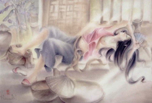 Hong Nắng Mới, ‘Exposure to Spring Sunlight’, presents a young woman who abandons herself to a nap in a bamboo hammock, her camisole with its straps negligently unfastened hanging half open over her chest. But why is it that one bare foot plants on a basket of goods while the other stays snuggly in a wooden clog? In her unconscious, what is she tightly holding on to?