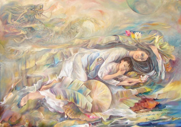 Writer Bùi Bích Hà I must admit an amazing fact, hard to believe both to myself and to others but quite true, that even though I lived in the city of Huế my entire childhood and adolescence, in those bygone days, like many Huế girls I was not familiar with all the well-known places in our city. There is Thiên An Hill where a Jesuit monastery is nestled in the pine forest. One can also think of Vọng Cảnh Hill stretched out under the blue sky, its image reflected in the broad mirror-like Perfume River. Meanwhile, abundant leafy trees shade Viễn Đệ pavilion, an old mansion on the north bank of the Bến Ngự River. It is said that within its brick-paved garden compound, a bust of Mrs. Viễn Đệ was placed by her husband to commemorate their heart-breaking separation when she left home and entered a Buddish temple to remove herself from the all too familiar mother-and daughter-in-law irreconcilable conflict. These three places, the images of which are enriched by folk imaginations, have remained mythic to me up to the present time. Fascinatingly, from that very poetic mythical environment emerged Thanh Trí, a well-known and talented woman. From her I learned that the college of Fine Arts was situated in the compound of the Viễn Đệ pavilion. It is a pleasure to reimaging Huế in the early 1960s, still heavily infused with old traditional values. At that time, while the majority of girls went to school with the sole purpose of obtaining a diploma which would help them build an ordinary life with the traditional value framework, some unique personalities stood apart from that well-worn path – like a sparkling raindrop persistently hanging on a high eave, or aneddy declining to flow with the stream, like a ray of brilliant sunlight sparking in the sky, or a wind gathering and disseminating pollen to generate unusually, abundant harvests. These young ladies would instead bring canvas, colors and brushes to the College of Fine Arts, where they attempted to live out the most sublime vision available to human existence: re-creation of the life of the universe and of humanity, either by painting artistic works, or by the processing of real or imagined images and by expressing these creative impulses in elegant individual language. As one of those few uncommon girls in their twenties, Thanh Trí graduated with high honors from the class of 1957-1961 of the Huế College of Fine Arts. Born into a landscape of splendid plants and trees, of magnificent mountains and rivers, her coming of age in that heavenly environment not only imbued her with an ability to deeply appreciate the beauty of the immense universe and the subtle human world around her, but also endowed her with a love and an aspiration to immortalize them in art – an activity itself a fierce resistance against the transistorizes of time and an assertive statement that each flashing moment, each ksana, captured by a painting is equivalent to a thousand years. An artist usually lives much more than merely his transient selfsame life, his inner being containing more than a single personality. This state of consciousness is an advantage while at the same time inculcating pain and disquietude – because of inner conflicts, because choices are usually not easily made when she has to reconcile the infinity of her thought and feelings with the finites of ordinary life. In spite of that, Thanh Trí has smoothly crossed such tremendous barriers throughout five decades. She is a wife, a mother, and now a grandmother, a painter and a poet all rolled into one, living her life in harmony, in happiness, and in tranquility. Those who have lived in Huế can perhaps never forget the sound of evening rain falling on banana leaves. It always seems so close to you, that rain, that liquid fall now splashing noisily over those broad green instruments and rubbing against your sensitive nerves, now dripping slowly like a sad lullaby melody which evokes a loneliness of the heart. Similarly, one cannot forget vast ponds filled with the fragrance of lotus flowers, pink and white, along side those young of light green hue. Those flowers are gatha poems chanted into emptiness, chanted in the refined Buddhist praying melody. The sweet gently mother in the cover art of Thanh Trí’s Tập Tranh thơ (Volume of Art and Poetry), enveloped in mother-child affection, abandons herself in a deep sleep to the comforting impulse of waves from the East Sea, her conical hat lying by her side. Even if the mother’s body has experienced pain and suffering, like a banana leaf mercilessly torn to shreds by wind and rain, her heart remains pristine like a calm lotus bud, and her child still basks in her protection, while the birds continue their song and the small fishes yet rear their offspring.