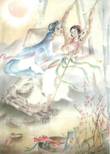 Meanwhile, the erotic appeal of Ngày Xuân Đánh Đu, ‘Swinging on the Spring Day’, is not a visual rendition of what the famous poetess Hồ Xuân Hương wrote in describing this recreational activity, where “four red trouser legs flutter in the wind, two pairs of beautiful limbs stretch side by side”. Rather, it is expressed in the image of two pairs of wooden clog scattered on the ground, having been kick off by a young man and a young woman in their rush to join each other on a swing. In the painting titled Suối Bataan Philippines, ‘Bataan Stream in the Philippines’, a clustered stand of tall grass is an expected element which highlights the vitality of a panoramic scene captured on silk. Since the works are not dated, I cannot tell at what point in time Thanh Trí turned to painting in oils. I am told that in the creative career of an artist, oil painting is very appealing temptation, a great challenge because it demands an integrated combination of soaring inspiration, precision in lines executed by a skillful hand holding a brush, and the prefigurement of an elegant color scheme. Indeed there is no room in indecision and blunder. Mistakes cannot be allowed. Like an arrow shot from a bow either hitting its target or getting lost in emptiness. Like uttered words, either echoing the sounds of bell and gong that move one’s heart or falling flat like a rhythmic folk melody produced by rapping on a bamboo instrument, soon sucked into silence. Thanh Trí has produced a rather large number of oil paintings. Even without privy to how much pain and/or pleasure with which she conceived ideas and turned them into art works, viewers like myself can immediately recognize an expression of gentle femininity, a suggestion of careful contemplation and deliberation in front of the canvas, and a projection of feelings and emotions into colors uniquely of her own tenor. She often uses bluish gray, brown blended with yellow, a subtle red streak here and there like a playful smile; and a light unobtrusive shade of purple, reflecting her perpetual longing for Huế, the romantic homeland whose hallmark color is violet as is attributed by popular imagination. In particular I like the piece title Đôi Vợ Chồng Mù tại Suối Tiên, ‘a Blind Husband and Wife Singing at Suối Tiên’, for the reason that when rendered in Thanh Tri’s art, even human miseries emanate a sense of peace; and Nỗi Nhớ Quê Hương, ‘Nostalgia for Homeland’, which captures the image of an old man, an expression of sorrow on his face, and the passage of time suggested by a background awash in the color of autumn leaves, all merge into a harmonious whole. Perhaps , as one becomes mature with age and experience, life appears more and more rough and hard, and one needs to expose its multifarious forms, break them, control them, and depict them by all suitable means one has to hand, responding to the aspirations of one’s own times. Leaving silk canvas and turning to wood surface, I am enchanted to see that Thanh Trí’s lacquer paintings also exhibit a graceful, smooth and lovely refreshing style. Indeed, in the hands of this artist, whether the material is fragile silk, stubborn oil colors, or insensate wood, human beings and their lives are depicted with vibrant emotion and passionate spirit.