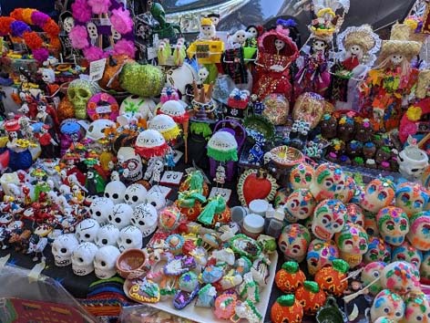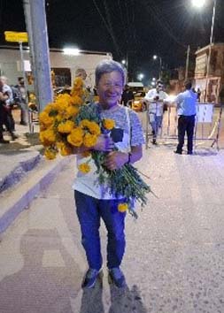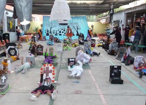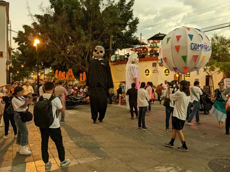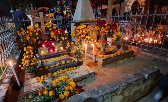 Tối ngày 31/10, được biết ở nghĩa trang Santa Cruz Xoxocotlán gần phi trường có tổ chức lễ hội viếng nghĩa trang rất lớn, chúng tôi ḷ ṃ tới xem. Dọc đường ghé sạp bán bông, trả 20 peso lấy một ôm to bông vạn thọ đă héo, xe hơi nhích từng chút, tới nơi đă thấy băi đậu chật nứt, người đi như nước cuốn. Nhưng… nó không giống những ǵ tôi tưởng tượng. Nó giống một ngày hội chợ như bất kỳ hội chợ nào khác. Hai bên đường là dăy lều bán đèn đuốc, mặt nạ, áo thun quảng cáo, tṛ giải trí… rồi lại có rất nhiều nơi bán bia rượu, khán đài tŕnh diễn nhạc. Trên đường đi có những đám múa h́nh nhân ma quỷ. Mọi người la hét nhảy nhót ồn ào, bia rượu trên tay.