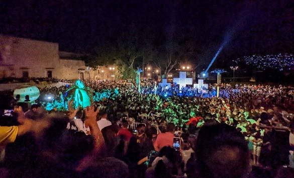 Khu được coi là điểm hẹn chính của mọi người, cũng là nơi nghỉ chân thư giăn và hóng mát buổi chiều, là khu quảng trường Zócalo, nơi có nhà thờ chính ṭa Oaxaca. Đây là một khoảng công viên rất rộng, nhiều bóng mát, có hàng quán tiệm tùng, dăy sạp bán đồ lưu niệm, mấy chục chiếc băng dài… Kế đó không xa là một công viên khác, cũng nổi tiếng nhờ nhà thờ La Sodedad (tên đầy đủ là Basílica de Nuestra Señora de la Soledad, Vương cung Thánh đường Đức Mẹ Cô Đơn – ám chỉ nỗi cô đơn khổ sở của Mẹ Maria sau khi Chúa Jesus bị đóng đinh), xây vào thế kỷ 17. Sân nhà thờ nơi đây thường được dùng làm nơi tŕnh diễn nhạc và kịch. Đi ngược lại, về phía bên kia Zócalo là con đường đi bộ thanh lịch Macedonia Alcalá rộng răi, mặt đường lát đá cục to, nơi dập d́u du khách dạo chơi, vào thăm những cửa tiệm thời trang nổi tiếng hay dùng bữa tại những nhà hàng sang trọng, nơi có thể giao tiếp bằng tiếng Anh. Cuối đường là nhà thờ Santo Domingo de Guzmán với kiến trúc baroque, được các giáo sĩ ḍng Đa Minh xây vào thế kỷ 16. Khu vực ba nhà thờ kể trên được coi là nơi sinh hoạt buổi chiều của dân Oaxaca. Những buổi trưa nóng rát mặt, đổ mồ hôi, Vương cung Thánh đường là chỗ nghỉ chân tuyệt vời. Điểm làm tôi chú ư là nghi thức làm dấu thánh giá ở đây không kết thúc bằng cách chắp tay và nguyện ‘Amen’ như Việt Nam mà họ đặt nhẹ mấy ngón tay lên môi. Có lẽ để tỏ dấu yêu kính Đức Chúa Trời chăng. Người nào muốn t́m hiểu thêm về những nhà thờ cổ của vùng này, có thể theo dấu chân các giáo sĩ Đa Minh ngày xưa đi truyền giáo qua một số nhà thờ họ đă xây lên, dọc con đường hành hương Ruta dominica. Trong lần đi thăm làng Zaachila, chúng tôi có ghé qua nhà thờ Cuilápam trên con đường này, nhưng không thu thập được ǵ, v́ nếu không có người hướng dẫn giải thích th́ như mù xem voi, tựa như một người ngoại quốc đến Việt Nam, được dẫn đi thăm nhà thờ Phát Diệm và nhà thờ La Vang mà không có một lời giải thích về lịch sử và nét cấu trúc độc đáo, cuối cùng chỉ nh́n loanh quanh và chụp mấy tấm ảnh cất trong máy. Có một màn hấp dẫn du khách nơi ba nhà thờ này, thường vào lúc xế chiều, là các màn nhảy múa ngoài trời của các cặp tân hôn, một tiết mục không thể thiếu trong lễ cưới của những gia đ́nh khá giả. Trong màn nhảy múa này, điểm nổi bật là hai h́nh nhân nam nữ bằng vải, gắn trùm bên ngoài khung nhôm hoặc gỗ, cao tới 3-4 thước, thêm vào đó là một cặp đèn lồng h́nh trái cầu, có cây cắm đặt trên đai da đeo trước bụng. Hai trái cầu này được quay tít suốt buổi lễ, hai h́nh nhân cũng được quay ṿng ṿng và nhảy múa đung đưa đôi tay trong tiếng nhạc xập x́nh và ḥ reo của mọi người. Múa lân ở Việt Nam không thấm ǵ khi so với tṛ này, tôi đă thử nhắc cái khung chưa có h́nh nhân, nó nặng trên 20kg, vậy mà họ quay cả tiếng đồng hồ không biết mỏi, tuy thỉnh thoảng phải thay người múa, v́ cả đám sẽ đi từ nhà thờ này tới nhà thờ khác, mỗi nơi nhảy một chập trong cái nắng gay gắt. Nghe nói mỗi h́nh nhân có giá trên dưới 1000USD, gần nửa năm lương công nhân lao động chứ đâu phải ít! Những trái cầu và h́nh nhân tương tự cũng được dùng trong một số lễ hội ngoài trời.