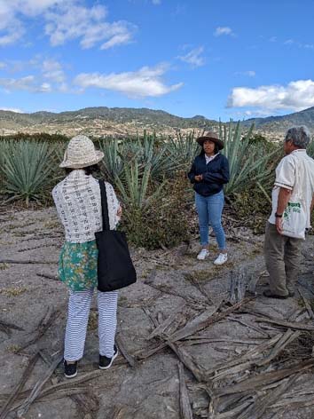 Trên lư thuyết, Mezcal có thể được làm từ đủ loại cây agave trộn chung nhau, nhưng đi xem thực tế, nơi nào cũng nói làm bằng agave Espadin! Tới một ḷ, gặng hỏi, mới biết là v́ agave Espadin lớn nhanh và cho sản lượng cao, mỗi thân cây – mà tiếng trong nghề là ‘trái thơm’ v́ nó có h́nh dạng tựa trái thơm – có thể nặng tới 250kg hoặc hơn nữa. Thân các loại agave khác, nhất là các loại agave mọc hoang trong rừng, chỉ khoảng 80-100kg, mà khô hơn, cho ít mật. À ra thế. Họ vui vẻ lấy một chai Mezcal làm từ nhiều loại agave cho nhắp thử, thơm hơn thật. Hỏi giá mấy chai này, chai nào cũng trên 200€. Chào thua, mắc gấp 5-10 lần Mezcal từ agave Espadin, mà chắc ǵ họ nói thiệt! Hèn chi Mezcal trong nhà hàng giá mắc là phải, nhất là Mezcal pha với các thứ trái cây hoặc hương liệu, thành cocktail, gọi là Mezcalini. Các ḷ rượu cũng có nhiều sáng kiến, trong lần chưng cất thứ 2, người ta có thể cho thêm vào các loại trái cây để tạo mùi, và… có nhiều nơi cho vào đó cả thịt gà tây, thịt heo, thịt thỏ, thịt nai… và cả con đuông trong cây agave nữa. Những thứ rượu pha thịt này có mùi gây gây. Một món khác,được trộn tùm lum là kem. Bạn có thể thấy người ta dùng tay trần nhào trộn kem với màu và mùi trong chảo gang ướp lạnh giữa thanh thiên bạch nhật. Ngoài những mùi vị thường thấy ở Âu châu, c̣n có một số mùi lạ như me, sa-pô-chê, ớt, đậu, agave, rau ng̣, rượu mezcal, tuna. Coi chừng, lầm chết! Tuna ngoài nghĩa thông thường là cá ngừ, ở Mexico c̣n một nghĩa khác, là trái cây của một loại xương rồng, ăn nhớt và vị hơi đắng. Rồi người ta c̣n trộn vào kem một thứ có lẽ không nơi nào khác có, đó là... châu chấu. Kem là món giải khát tương đối mắc, nhưng tiệm kem La Soledad ở cạnh nhà thờ cùng tên đă nổi tiếng tới mức có câu ‘chưa biết tiệm La Soledad là chưa biết Oaxaca’. Tôi vừa đề cập đến châu chấu. Đây là một trong những món ăn đặc biệt, phổ thông ở vùng nam Mexico này. Đây là loại châu chấu nhỏ, người Mexico gọi nó là Chapuline. Châu chấu Chapuline được nuôi trong những cánh đồng trồng cỏ alfafa. Khi chúng tôi đến Oaxaca, mùa châu chấu vừa chấm dứt, nhưng ở chợ c̣n bán rất nhiều. Chúng được rang với ớt, muối, tỏi trong chảo sành đến khô queo, thêm chút nước chanh cho bán mùi, để trong rổ hoặc thúng, theo cỡ lớn nhỏ. Nếu bỏ được ấn tượng đang ăn côn trùng, th́ thấy cũng được, không có cảm giác nhờn nhợn trong cổ như ăn nhện tarantula chiên ở Cambodia. Chapulines chưa trưởng thành, mập bằng đầu đũa, ăn hơi giống tép rang, mắc nhất. Càng lớn giá càng rẻ, tới con lớn nhất mập cỡ ngón tay út, ăn xảm v́ chân và cánh của chúng quá lớn. Chapulines được chế thành rất nhiều món ăn. Tôi đă thử vài món: bọc trong phô-mai rồi lăn bột chiên gịn, hoặc trộn với gia vị và rải lên bánh tortilla cùng phô mai quesillo, hoặc nghiền nhỏ làm nước sốt chấm, và ngay cả ăn luôn món rang muối không chế biến, nhưng thú thực nó không gây ấn tượng ǵ đặc biệt. Ở Việt Nam, hiện nay con nhộng tằm cũng được chế biến thành nhiều món.